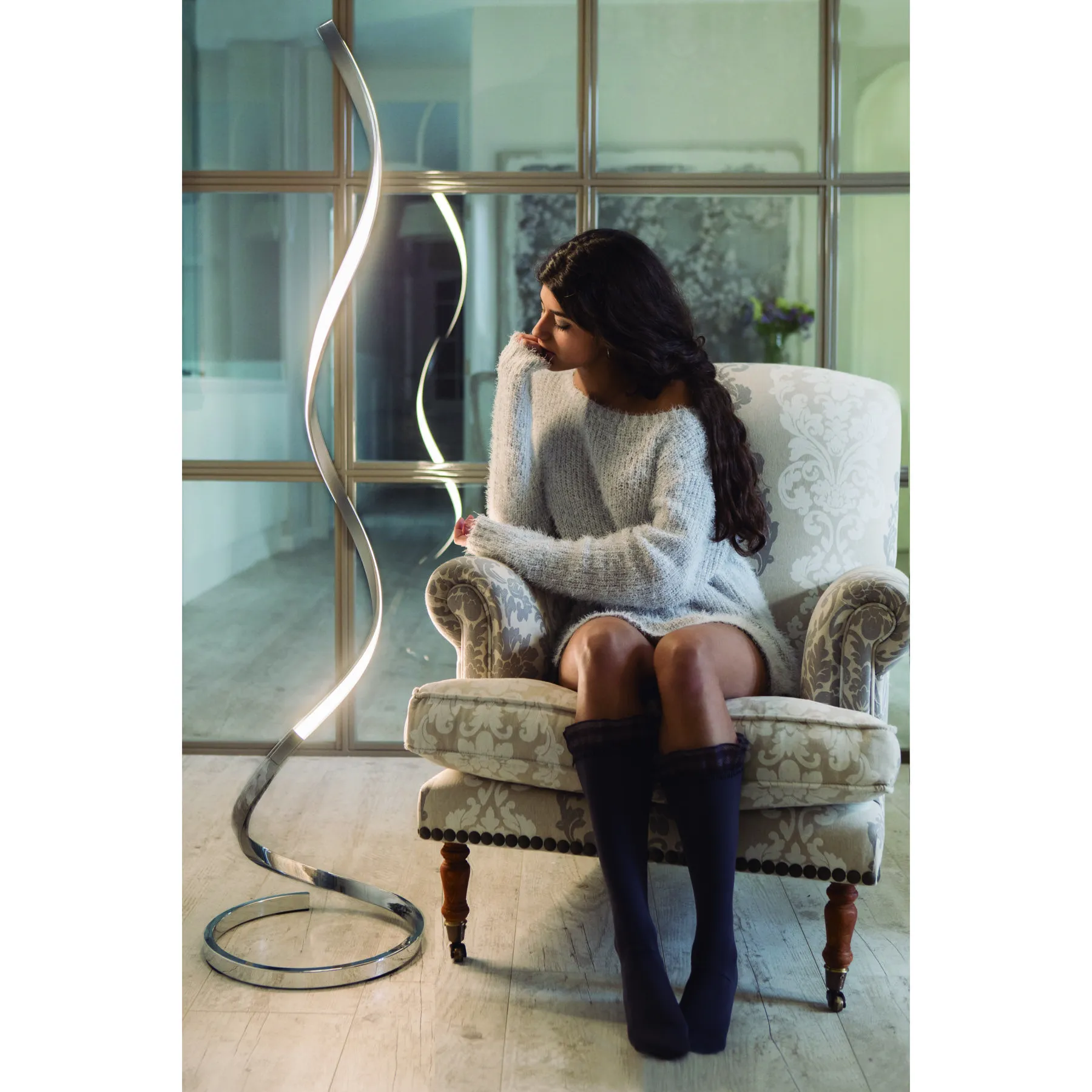 Доминантой коллекции становится потолочный светильник с двумя световыми петлями в форме знака бесконечности, передавая образ цикличности света. Масштабные светильники коллекции будут хорошо смотреться в элегантной гостиной в сочетании с отсылками к органичности или в обеденной зоне в качестве главного источника света.